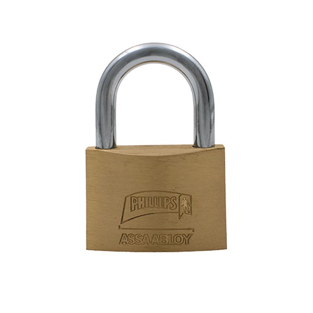 Candado de bronce Phillips de 40mm. Cuerpo, cerrojo y cilindro en latón macizo. Resistente a la intemperie. Anti-palanca. Incluye 2 llaves.
